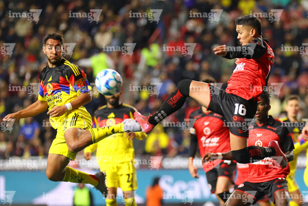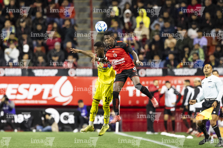 Tijuana, Baja California, 9 de enero de 2026. José Ignacio Rivero y Rodrigo Dourado, durante el partido correspondiente a la jornada 1 del torneo Clausura 2026 de la Liga BBVA MX, entre los Xolos de Tijuana y las Águilas del América, realizado en el estadio Caliente. Foto: Imago7/Alejandro Gutiérrez Mora