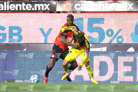 Tijuana, Baja California, 9 de enero de 2026. Cristian Borja y Adonis Preciado, durante el partido correspondiente a la jornada 1 del torneo Clausura 2026 de la Liga BBVA MX, entre los Xolos de Tijuana y las Águilas del América, realizado en el estadio Caliente. Foto: Imago7/Alejandro Gutiérrez Mora
