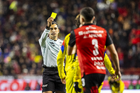 Tijuana, Baja California, 9 de enero de 2026. Ismael Rosario López, árbitro central muestra tarjeta amarilla de amonestación, durante el partido correspondiente a la jornada 1 del torneo Clausura 2026 de la Liga BBVA MX, entre los Xolos de Tijuana y las Águilas del América, realizado en el estadio Caliente. Foto: Imago7/Alejandro Gutiérrez Mora