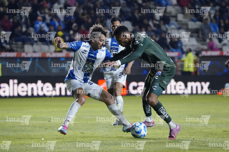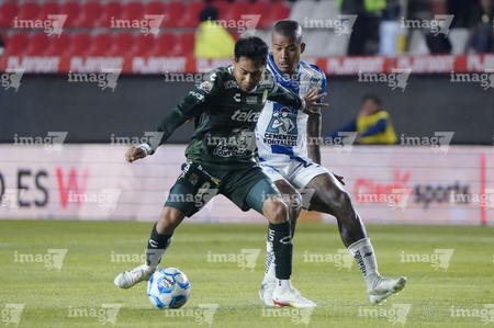 Pachuca, Hidalgo, 13 de enero de 2026. Alan Mozo y Jordi Cortizo, durante el partido correspondiente a la jornada 2 del torneo Clausura 2026 de la Liga BBVA MX, entre los Tuzos del Pachuca y los Esmeraldas del León, realizado en el estadio Hidalgo. Foto: Imago7/ Sebastian Laureano Miranda