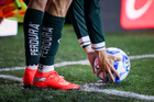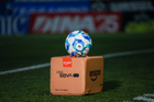 Pachuca, Hidalgo, 13 de enero de 2026. Balón de futbol Voit Aereus sobre caja de Amazon, durante el partido correspondiente a la jornada 2 del torneo Clausura 2026 de la Liga BBVA MX, entre los Tuzos del Pachuca y los Esmeraldas del León, realizado en el estadio Hidalgo. Foto: Imago7/ Elizabeth Hernández