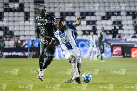 Pachuca, Hidalgo, 13 de enero de 2026. Jhonder Cádiz y Oscar Jiménez, durante el partido correspondiente a la jornada 2 del torneo Clausura 2026 de la Liga BBVA MX, entre los Tuzos del Pachuca y los Esmeraldas del León, realizado en el estadio Hidalgo. Foto: Imago7/ Sebastian Laureano Miranda