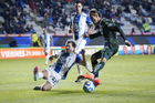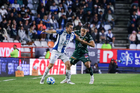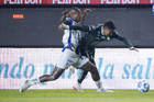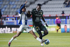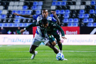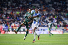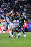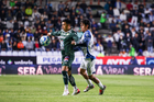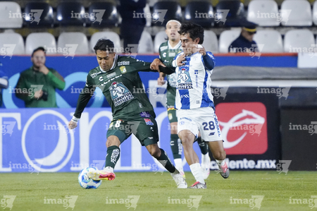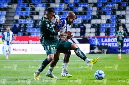 Pachuca, Hidalgo, 13 de enero de 2026. Juan Pablo Domínguez y Robert Kenedy, durante el partido correspondiente a la jornada 2 del torneo Clausura 2026 de la Liga BBVA MX, entre los Tuzos del Pachuca y los Esmeraldas del León, realizado en el estadio Hidalgo. Foto: Imago7/ Sebastian Laureano Miranda