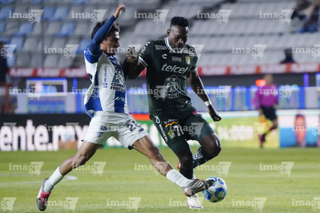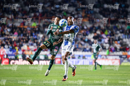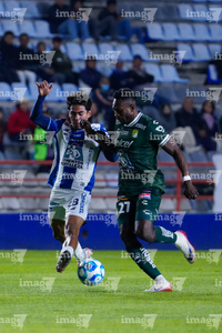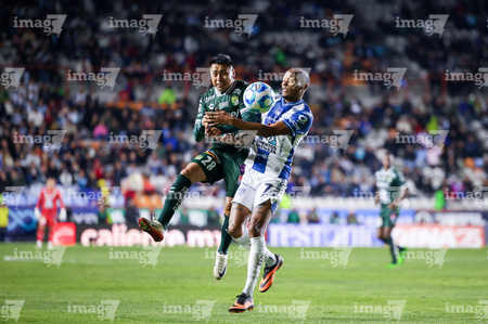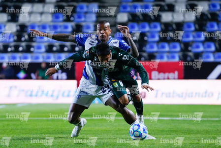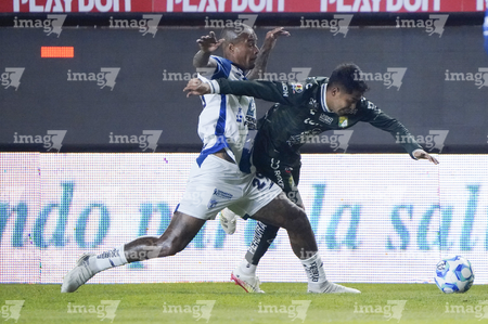 Pachuca, Hidalgo, 13 de enero de 2026. Alan Mozo y Diber Cambindo, durante el partido correspondiente a la jornada 2 del torneo Clausura 2026 de la Liga BBVA MX, entre los Tuzos del Pachuca y los Esmeraldas del León, realizado en el estadio Hidalgo. Foto: Imago7/ Sebastian Laureano Miranda