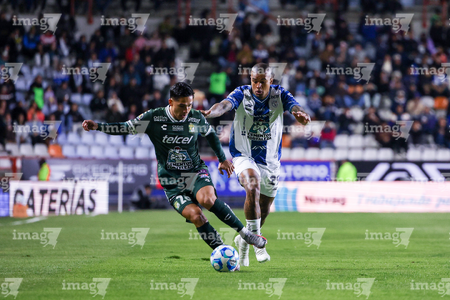 Pachuca, Hidalgo, 13 de enero de 2026. Robert Kenedy y Juan Pablo Domínguez, durante el partido correspondiente a la jornada 2 del torneo Clausura 2026 de la Liga BBVA MX, entre los Tuzos del Pachuca y los Esmeraldas del León, realizado en el estadio Hidalgo. Foto: Imago7/ Jacqueline Pedraza