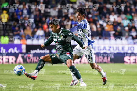 Pachuca, Hidalgo, 13 de enero de 2026. Oussama Idrissi y Bryan Colula, durante el partido correspondiente a la jornada 2 del torneo Clausura 2026 de la Liga BBVA MX, entre los Tuzos del Pachuca y los Esmeraldas del León, realizado en el estadio Hidalgo. Foto: Imago7/ Elizabeth Hernández