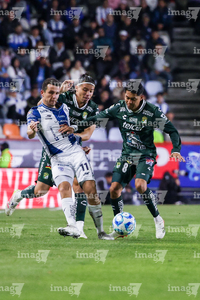 Pachuca, Hidalgo, 13 de enero de 2026. Oussama Idrissi, Bryan Colula y Juan Pablo Domínguez, durante el partido correspondiente a la jornada 2 del torneo Clausura 2026 de la Liga BBVA MX, entre los Tuzos del Pachuca y los Esmeraldas del León, realizado en el estadio Hidalgo. Foto: Imago7/ Elizabeth Hernández