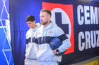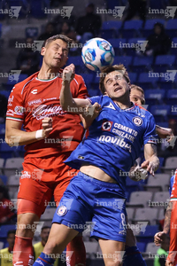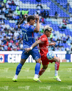 Puebla, Puebla, 13 de enero de 2026. Gabriel Fernández "Toro" y Gaddi Aguirre, durante el partido correspondiente a la jornada 2 del torneo Clausura 2026 de la Liga BBVA MX, entre la Máquina Celeste del Cruz Azul y los Rojinegros del Atlas, realizado en el estadio Cuauhtémoc. Foto: Imago7/Mireya Novo
