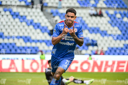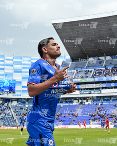 Puebla, Puebla, 13 de enero de 2026. Gabriel Fernández en festejo de gol, durante el partido correspondiente a la jornada 2 del torneo Clausura 2026 de la Liga BBVA MX, entre la Máquina Celeste del Cruz Azul y los Rojinegros del Atlas, realizado en el estadio Cuauhtémoc. Foto: Imago7/ Alexis Chavez