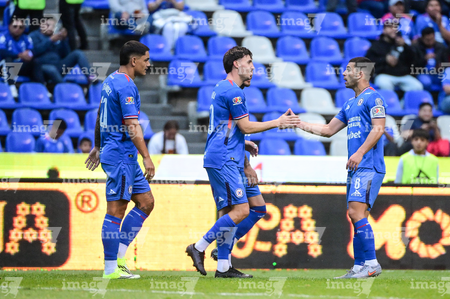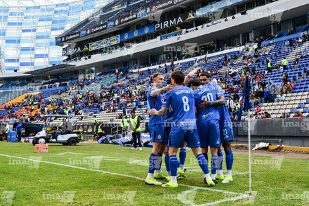 Puebla, Puebla, 13 de enero de 2026. Jugadores de Cruz Azul en festejo de gol, durante el partido correspondiente a la jornada 2 del torneo Clausura 2026 de la Liga BBVA MX, entre la Máquina Celeste del Cruz Azul y los Rojinegros del Atlas, realizado en el estadio Cuauhtémoc. Foto: Imago7/ Diego Alducin