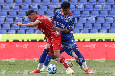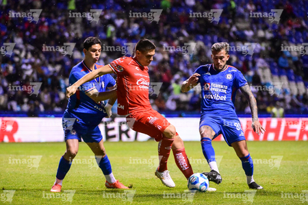 Puebla, Puebla, 13 de enero de 2026. Amaury García, Uros Durdevic y Gonzalo Piovi, durante el partido correspondiente a la jornada 2 del torneo Clausura 2026 de la Liga BBVA MX, entre la Máquina Celeste del Cruz Azul y los Rojinegros del Atlas, realizado en el estadio Cuauhtémoc. Foto: Imago7/ Alexis Chavez