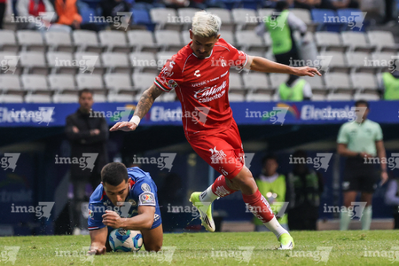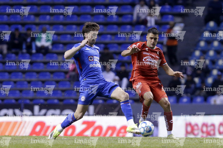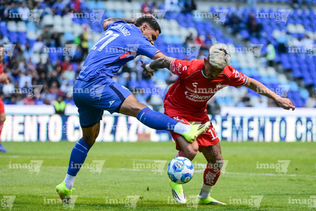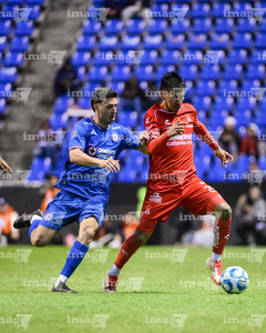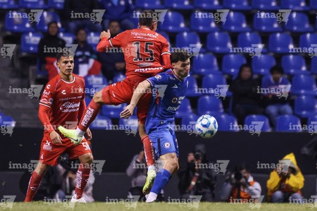 Puebla, Puebla, 13 de enero de 2026. Paulo Ramirez y José Paradela, durante el partido correspondiente a la jornada 2 del torneo Clausura 2026 de la Liga BBVA MX, entre la Máquina Celeste del Cruz Azul y los Rojinegros del Atlas, realizado en el estadio Cuauhtémoc. Foto: Imago7/ Diego Alducin