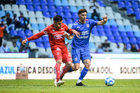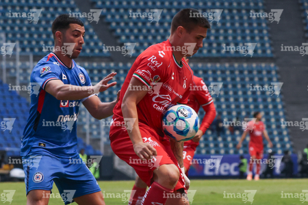 Puebla, Puebla, 13 de enero de 2026. Uros Durdevic y Roberto Suarez, durante el partido correspondiente a la jornada 2 del torneo Clausura 2026 de la Liga BBVA MX, entre la Máquina Celeste del Cruz Azul y los Rojinegros del Atlas, realizado en el estadio Cuauhtémoc. Foto: Imago7/ Alexis Chavez