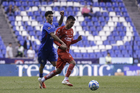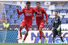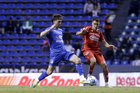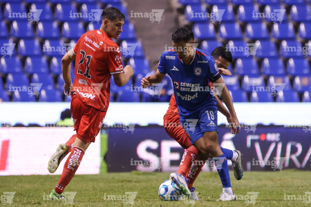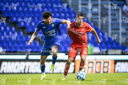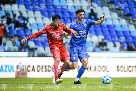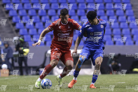 Puebla, Puebla, 13 de enero de 2026. Omar Campos y Jeremy Márquez, durante el partido correspondiente a la jornada 2 del torneo Clausura 2026 de la Liga BBVA MX, entre la Máquina Celeste del Cruz Azul y los Rojinegros del Atlas, realizado en el estadio Cuauhtémoc. Foto: Imago7/ Alexis Chavez