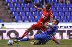 Puebla, Puebla, 13 de enero de 2026. Erik Lira y Uros Durdevic, durante el partido correspondiente a la jornada 2 del torneo Clausura 2026 de la Liga BBVA MX, entre la Máquina Celeste del Cruz Azul y los Rojinegros del Atlas, realizado en el estadio Cuauhtémoc. Foto: Imago7/ Diego Alducin