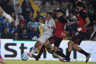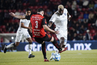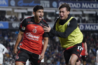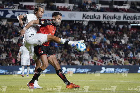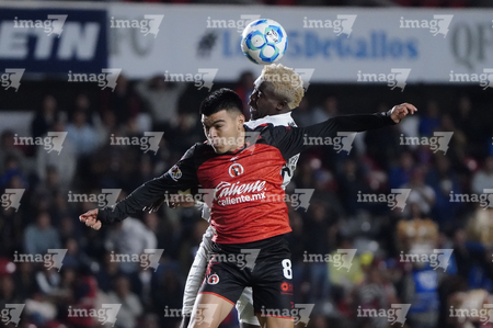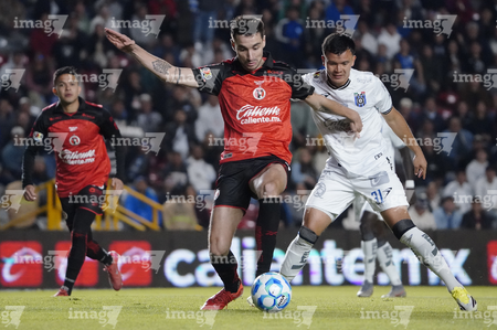 Querétaro, Querétaro, 14 de enero de 2026. Iván Tona y Michael Carcelen, durante el partido correspondiente a la jornada 2 del torneo Clausura 2026 de la Liga BBVA MX, entre los Gallos Blancos del Querétaro y los Xolos de Tijuana, realizado en el estadio La Corregidora. Foto: Imago7/ Sebastian Laureano Miranda