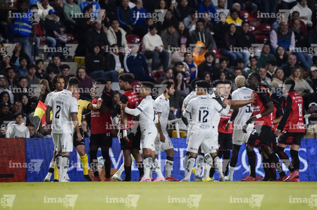 Querétaro, Querétaro, 14 de enero de 2026. Jugadores de Querétaro y Jugadores de Xolos en conato de bronca, durante el partido correspondiente a la jornada 2 del torneo Clausura 2026 de la Liga BBVA MX, entre los Gallos Blancos del Querétaro y los Xolos de Tijuana, realizado en el estadio La Corregidora. Foto: Imago7/ Sebastian Laureano Miranda
