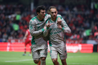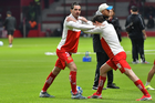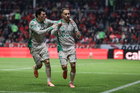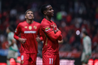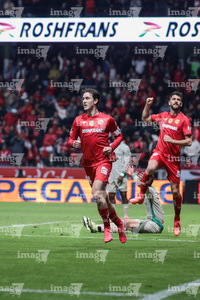 Toluca, Estado de México, 14 de enero de 2026. Helinho y Marcel Ruiz en festejo de gol, durante el partido correspondiente a la jornada 2 del torneo Clausura 2026 de la Liga BBVA MX, entre los Diablos Rojos del Toluca y los Guerreros de Santos Laguna, realizado en el estadio Nemesio Diez. Foto: Imago7/