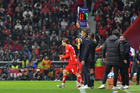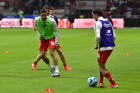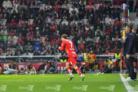 Toluca, Estado de México, 14 de enero de 2026. Jorge Díaz Price entra de cambio a Jesús Angulo "Canelo", durante el partido correspondiente a la jornada 2 del torneo Clausura 2026 de la Liga BBVA MX, entre los Diablos Rojos del Toluca y los Guerreros de Santos Laguna, realizado en el estadio Nemesio Diez. Foto: Imago7 / Daniel Arriaga