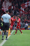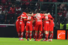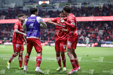 Toluca, Estado de México, 14 de enero de 2026. Jugadores del Toluca en festejo, durante el partido correspondiente a la jornada 2 del torneo Clausura 2026 de la Liga BBVA MX, entre los Diablos Rojos del Toluca y los Guerreros de Santos Laguna, realizado en el estadio Nemesio Diez. Foto: Imago7/ Arturo Hernández