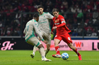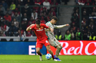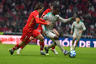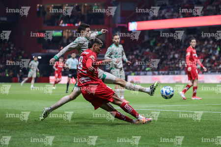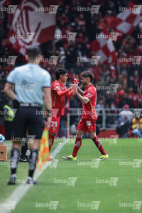 Toluca, Estado de México, 14 de enero de 2026. Jesús Angulo "Canelo" y Bruno Amione, durante el partido correspondiente a la jornada 2 del torneo Clausura 2026 de la Liga BBVA MX, entre los Diablos Rojos del Toluca y los Guerreros de Santos Laguna, realizado en el estadio Nemesio Diez. Foto: Imago7 / Daniel Arriaga