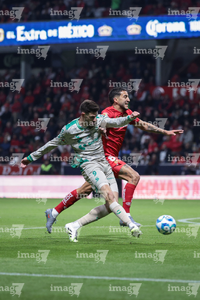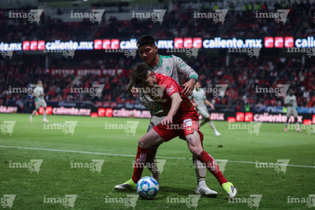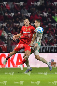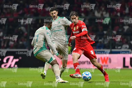 Toluca, Estado de México, 14 de enero de 2026. Nicolas Castro y Ezequiel Bullaude, durante el partido correspondiente a la jornada 2 del torneo Clausura 2026 de la Liga BBVA MX, entre los Diablos Rojos del Toluca y los Guerreros de Santos Laguna, realizado en el estadio Nemesio Diez. Foto: Imago7/ Arturo Hernández