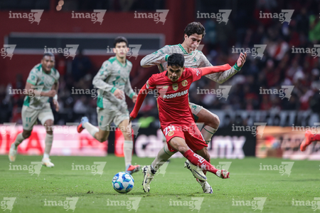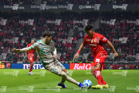 Toluca, Estado de México, 14 de enero de 2026. Franco Romero y Ezequiel Bullaude, durante el partido correspondiente a la jornada 2 del torneo Clausura 2026 de la Liga BBVA MX, entre los Diablos Rojos del Toluca y los Guerreros de Santos Laguna, realizado en el estadio Nemesio Diez. Foto: Imago7/ Arturo Hernández
