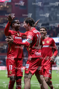 Toluca, Estado de México, 14 de enero de 2026. Diego Barbosa, Jesús Gallardo y Marcel Ruiz en festejo de gol, durante el partido correspondiente a la jornada 2 del torneo Clausura 2026 de la Liga BBVA MX, entre los Diablos Rojos del Toluca y los Guerreros de Santos Laguna, realizado en el estadio Nemesio Diez. Foto: Imago7/