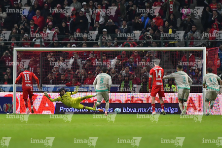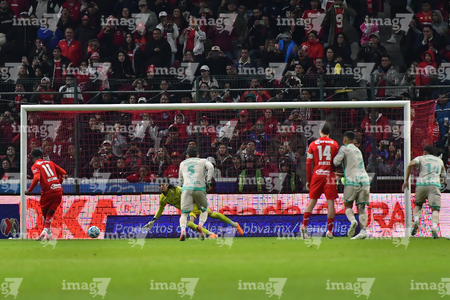 Toluca, Estado de México, 14 de enero de 2026. Helinho anota gol de penal a Carlos Acevedo, durante el partido correspondiente a la jornada 2 del torneo Clausura 2026 de la Liga BBVA MX, entre los Diablos Rojos del Toluca y los Guerreros de Santos Laguna, realizado en el estadio Nemesio Diez. Foto: Imago7/ Arturo Hernández