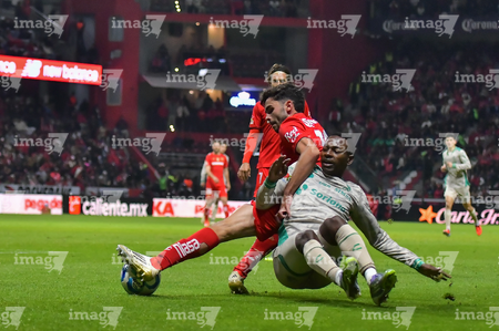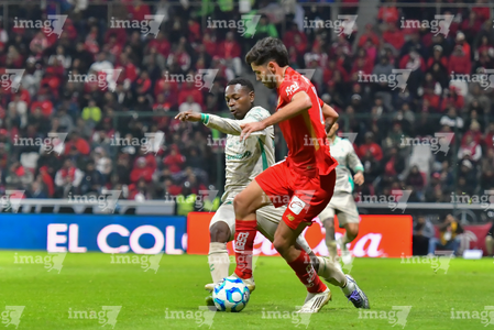 Toluca, Estado de México, 14 de enero de 2026. Sebastián Córdova y Kevin Palacios, durante el partido correspondiente a la jornada 2 del torneo Clausura 2026 de la Liga BBVA MX, entre los Diablos Rojos del Toluca y los Guerreros de Santos Laguna, realizado en el estadio Nemesio Diez. Foto: Imago7/ Arturo Hernández