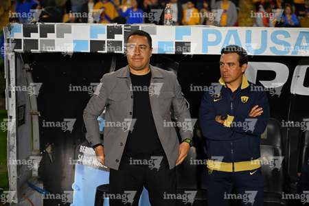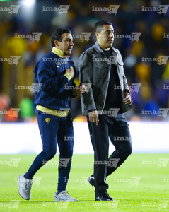 San Nicolás de los Garza, Nuevo León, 14 de enero de 2026. Luis Ernesto Pérez, auxiliar técnico y Efraín Juárez, director técnico, durante el partido correspondiente a la jornada 2 del torneo Clausura 2026 de la Liga BBVA MX, entre los Tigres de la UANL y los Pumas de la UNAM, realizado en el estadio Universitario. Foto: Imago7/