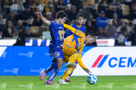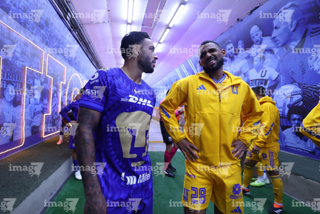 San Nicolás de los Garza, Nuevo León, 14 de enero de 2026. César Garza y Juan Brunetta, durante el partido correspondiente a la jornada 2 del torneo Clausura 2026 de la Liga BBVA MX, entre los Tigres de la UANL y los Pumas de la UNAM, realizado en el estadio Universitario. Foto: Imago7/