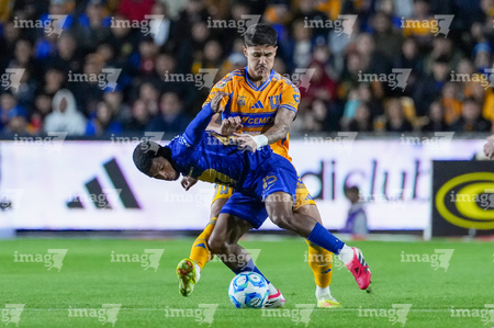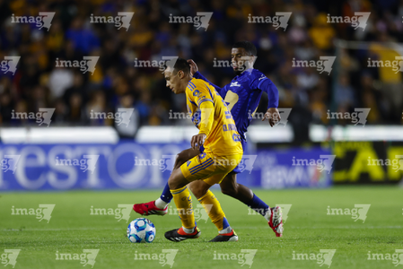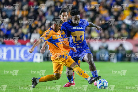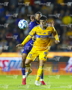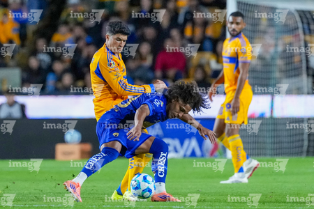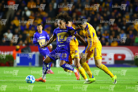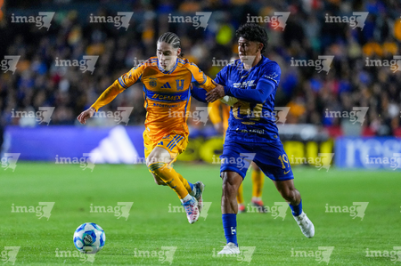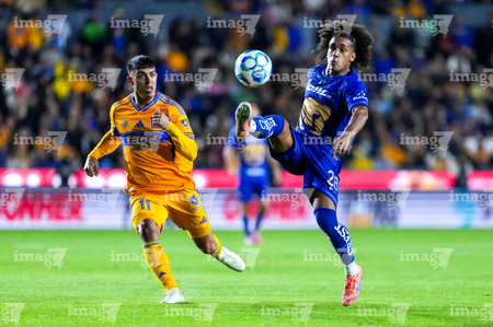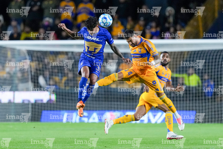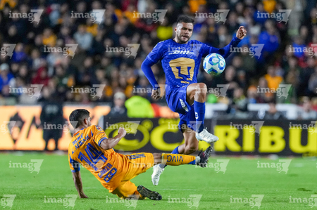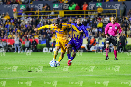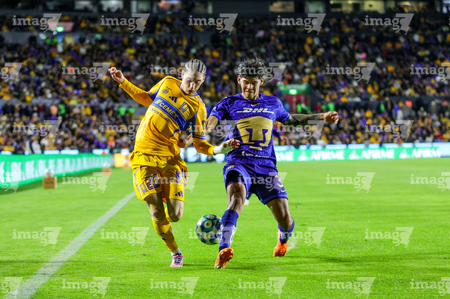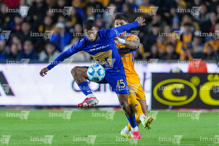 San Nicolás de los Garza, Nuevo León, 14 de enero de 2026. Jesús Garza y Alvaro Angulo, durante el partido correspondiente a la jornada 2 del torneo Clausura 2026 de la Liga BBVA MX, entre los Tigres de la UANL y los Pumas de la UNAM, realizado en el estadio Universitario. Foto: Imago7/ Andrea Jiménez