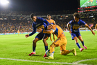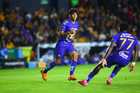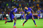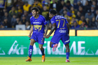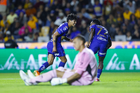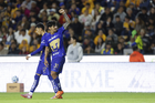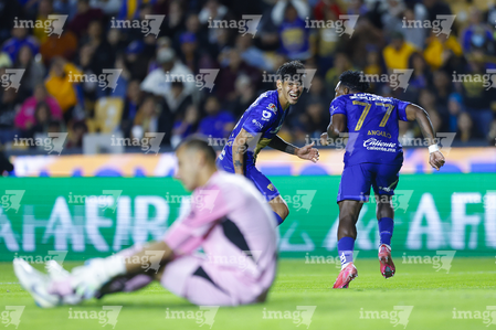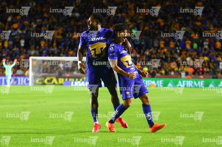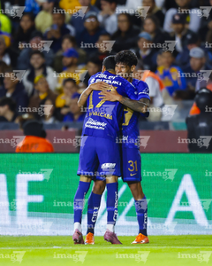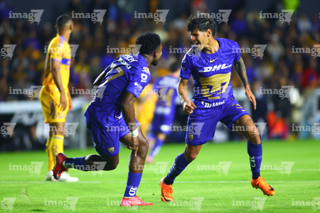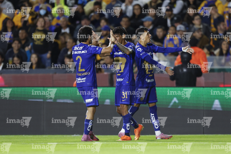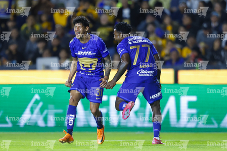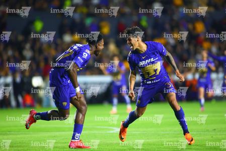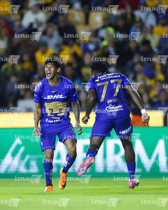 San Nicolás de los Garza, Nuevo León, 14 de enero de 2026. Robert Morales y Alvaro Angulo en festejo de gol, durante el partido correspondiente a la jornada 2 del torneo Clausura 2026 de la Liga BBVA MX, entre los Tigres de la UANL y los Pumas de la UNAM, realizado en el estadio Universitario. Foto: Imago7/