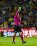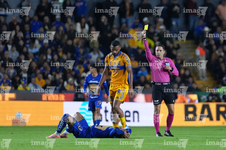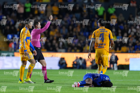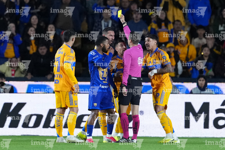 San Nicolás de los Garza, Nuevo León, 14 de enero de 2026. Jesús Rafael López, árbitro central muestra tarjeta amarilla de amonestación, durante el partido correspondiente a la jornada 2 del torneo Clausura 2026 de la Liga BBVA MX, entre los Tigres de la UANL y los Pumas de la UNAM, realizado en el estadio Universitario. Foto: Imago7/David Arzamendi