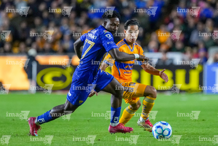 San Nicolás de los Garza, Nuevo León, 14 de enero de 2026. Alvaro Angulo y Diego Lainez, durante el partido correspondiente a la jornada 2 del torneo Clausura 2026 de la Liga BBVA MX, entre los Tigres de la UANL y los Pumas de la UNAM, realizado en el estadio Universitario. Foto: Imago7/ Andrea Jiménez