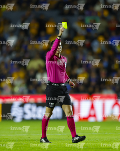 San Nicolás de los Garza, Nuevo León, 14 de enero de 2026. Jesús Rafael López, árbitro central muestra tarjeta amarilla de amonestación, durante el partido correspondiente a la jornada 2 del torneo Clausura 2026 de la Liga BBVA MX, entre los Tigres de la UANL y los Pumas de la UNAM, realizado en el estadio Universitario. Foto: Imago7/ Andrea Jiménez