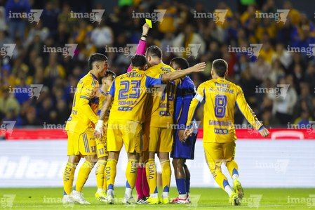 San Nicolás de los Garza, Nuevo León, 14 de enero de 2026. Jugadores de Tigres en reclamo a Jesús Rafael López, árbitro central, durante el partido correspondiente a la jornada 2 del torneo Clausura 2026 de la Liga BBVA MX, entre los Tigres de la UANL y los Pumas de la UNAM, realizado en el estadio Universitario. Foto: Imago7/