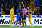 San Nicolás de los Garza, Nuevo León, 14 de enero de 2026. Jesús Rafael López, árbitro central muestra tarjeta amarilla de amonestación a Juan Sánchez, durante el partido correspondiente a la jornada 2 del torneo Clausura 2026 de la Liga BBVA MX, entre los Tigres de la UANL y los Pumas de la UNAM, realizado en el estadio Universitario. Foto: Imago7/ Andrea Jiménez