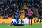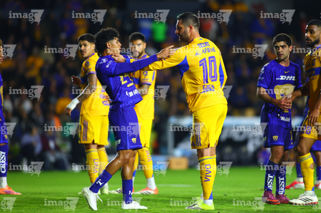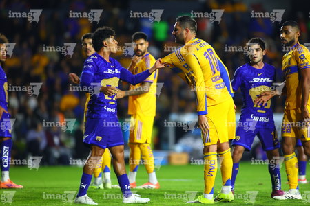 San Nicolás de los Garza, Nuevo León, 14 de enero de 2026. César Garza y André-Pierre Gignac en conato de bronca, durante el partido correspondiente a la jornada 2 del torneo Clausura 2026 de la Liga BBVA MX, entre los Tigres de la UANL y los Pumas de la UNAM, realizado en el estadio Universitario. Foto: Imago7/David Arzamendi