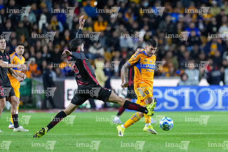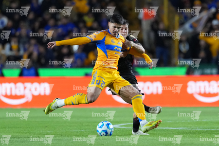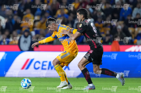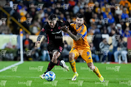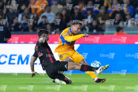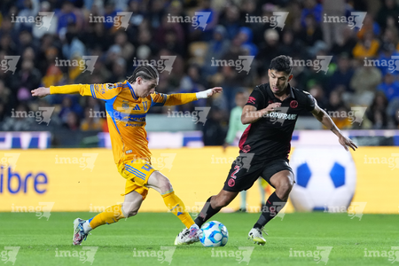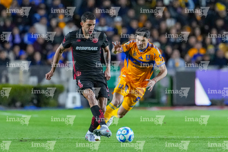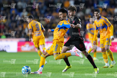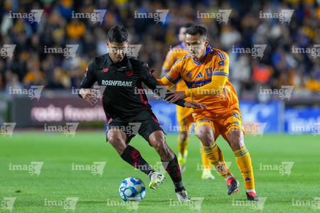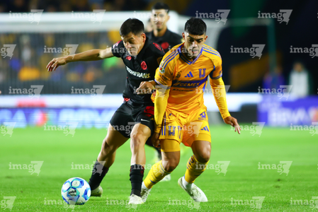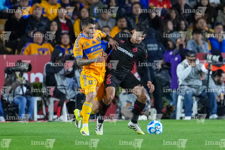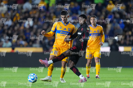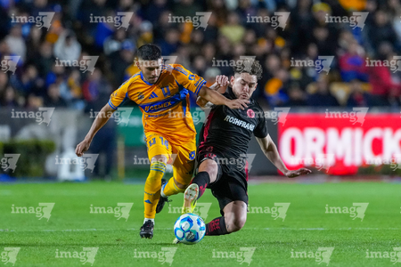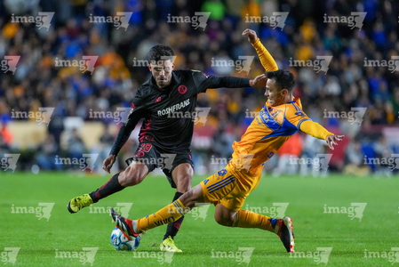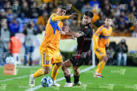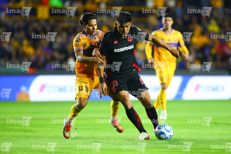 San Nicolás de los Garza, Nuevo León, 17 de enero de 2026. Jesús Garza y Jesús Angulo "Canelo", durante el partido correspondiente a la jornada 3 del torneo Clausura 2026 de la Liga BBVA MX, entre los Tigres de la UANL y los Diablos Rojos del Toluca, realizado en el estadio Universitario. Foto: Imago7/ Andrea Jiménez
