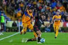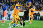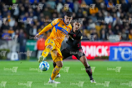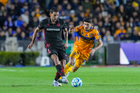 San Nicolás de los Garza, Nuevo León, 17 de enero de 2026. Jesús Angulo "Canelo" y Diego Lainez, durante el partido correspondiente a la jornada 3 del torneo Clausura 2026 de la Liga BBVA MX, entre los Tigres de la UANL y los Diablos Rojos del Toluca, realizado en el estadio Universitario. Foto: Imago7/David Arzamendi