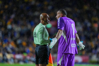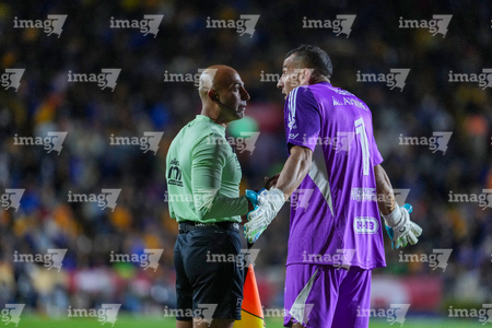 San Nicolás de los Garza, Nuevo León, 17 de enero de 2026. Nahuel Guzmán y Oscar Mejía García, árbitro central, durante el partido correspondiente a la jornada 3 del torneo Clausura 2026 de la Liga BBVA MX, entre los Tigres de la UANL y los Diablos Rojos del Toluca, realizado en el estadio Universitario. Foto: Imago7/David Arzamendi