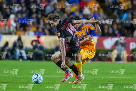 San Nicolás de los Garza, Nuevo León, 17 de enero de 2026. Franco Romero y Juan Brunetta, durante el partido correspondiente a la jornada 3 del torneo Clausura 2026 de la Liga BBVA MX, entre los Tigres de la UANL y los Diablos Rojos del Toluca, realizado en el estadio Universitario. Foto: Imago7/David Arzamendi