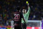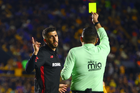San Nicolás de los Garza, Nuevo León, 17 de enero de 2026. Oscar Mejía García, árbitro central muestra tarjeta amarilla de amonestación a Paulinho, durante el partido correspondiente a la jornada 3 del torneo Clausura 2026 de la Liga BBVA MX, entre los Tigres de la UANL y los Diablos Rojos del Toluca, realizado en el estadio Universitario. Foto: Imago7/David Arzamendi