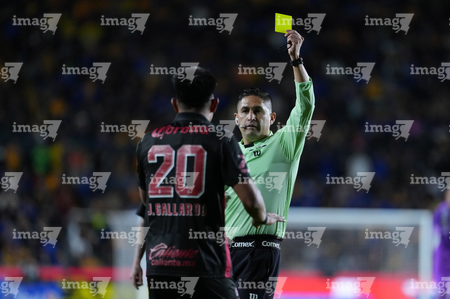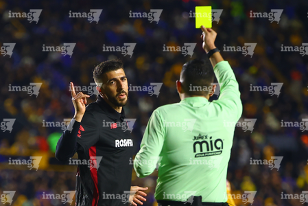 San Nicolás de los Garza, Nuevo León, 17 de enero de 2026. Oscar Mejía García, árbitro central muestra tarjeta amarilla de amonestación a Jesús Gallardo, durante el partido correspondiente a la jornada 3 del torneo Clausura 2026 de la Liga BBVA MX, entre los Tigres de la UANL y los Diablos Rojos del Toluca, realizado en el estadio Universitario. Foto: Imago7/ Andrea Jiménez