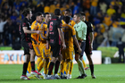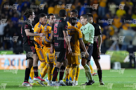 San Nicolás de los Garza, Nuevo León, 17 de enero de 2026. Jugadores de Tigres en reclamo a Oscar Mejía García, árbitro central, durante el partido correspondiente a la jornada 3 del torneo Clausura 2026 de la Liga BBVA MX, entre los Tigres de la UANL y los Diablos Rojos del Toluca, realizado en el estadio Universitario. Foto: Imago7/ Andrea Jiménez