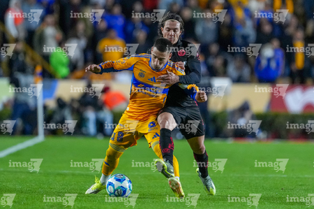 San Nicolás de los Garza, Nuevo León, 17 de enero de 2026. Nicolas Castro y Juan Pablo Vigon, durante el partido correspondiente a la jornada 3 del torneo Clausura 2026 de la Liga BBVA MX, entre los Tigres de la UANL y los Diablos Rojos del Toluca, realizado en el estadio Universitario. Foto: Imago7/ Andrea Jiménez