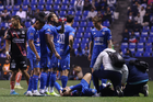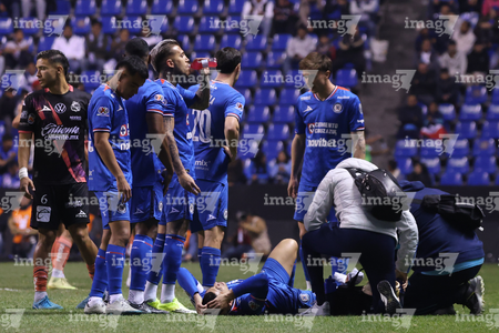 Puebla, Puebla, 17 de enero de 2026. Erik Lira resultó lesionado, durante el partido correspondiente a la jornada 3 del torneo Clausura 2026 de la Liga BBVA MX, entre la Máquina Celeste del Cruz Azul y el Club Puebla, realizado en el estadio Cuauhtémoc. Foto: Imago7/ Diego Alducin