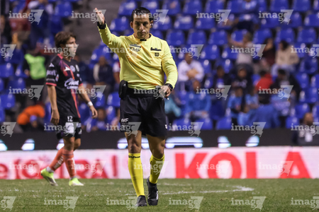 Puebla, Puebla, 17 de enero de 2026. Mario Terrazas Chávez, árbitro central, durante el partido correspondiente a la jornada 3 del torneo Clausura 2026 de la Liga BBVA MX, entre la Máquina Celeste del Cruz Azul y el Club Puebla, realizado en el estadio Cuauhtémoc. Foto: Imago7/ Diego Alducin
